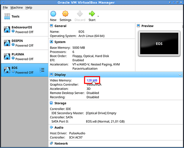 Pomáhá změnit nastavení zobrazení tak, aby bylo použito starší lépe implementované VBoxVGA v nastavení jako řídicí zařízení. Ale protože VirtualBOX nyní dává varování, že máte špatné nastavení, pokud zvolíte toto, a zdá se, že VMSVGA (co VirtualBox nastavil jako výchozí pro hosty Linuxu) stále nefunguje správně s hosty založenými na Arch, vrátí se na výchozí nastavení, když opustíte okno nastavení a musíte jej nastavit z hlavního přehledu Boxu: