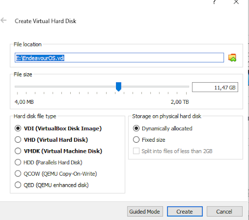 Vytvořte si nový stroj se svým oblíbeným jménem, ​​například –> EndeavourOS