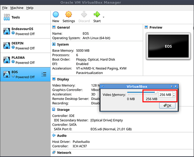 Někdy se nastavení vrátí, takže před spuštěním ArchBoxu zkontrolujte, zda je Graphic-Controller nastaven na VBoxSVGA! z této obrazovky můžete také nastavit paměť pro grafiku větší než 125 MB: