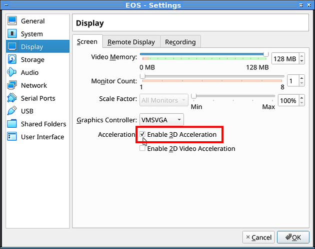 Nyní se VboxSVGA se zaškrtnutým 3D drží vpravo.